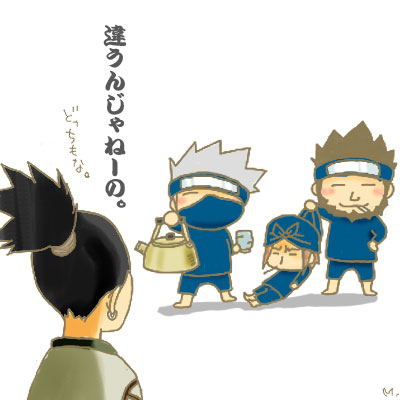 「あ、猫がいる」 「ん?」 きつい、危険、汚い任務明けの帰り道、毛色の変わった猫を見つけた。 もしも猫を拾ったら 「ほら、あれ」 カカシが指差す先には、彼らの背丈とほぼ同じ高さと彼らが腕をいっぱいに伸ばし ても囲めなさそうな容積を誇る巨大な石が。 「あン?」 何もねぇじゃねぇかと言おうと開きかけた口が、中途半端な位置で止まった。 よくよく見ればその上に、なにやらもぞもぞと動く白い物体が見える。 「……何してやがんだ?」 「相変わらず鈍いね、アスマ」 岩の上に登ったはいいが、怖くて降りれなくなったに決まってるでしょ〜よ。 そう呟くや否や、次の瞬間には岩の傍らに立って「どうしたの?」と、『猫』に話 しかけていた。 相変わらずマメな奴だと呆れつつ成り行きを見守っていれば、どうやら『猫』は思 いっきり風貌の怪しげなカカシに警戒心をむき出しにしているようで。 身体を縮めて後ろに引きながらもじろりと睨んでいる。 ……全く迫力はないが。 「だいじょーぶ、怖くないからこっちにおいで?」 「……」 カカシが手を差し伸べてもじっとその手を見つめるだけ。 警戒心でいっぱいの瞳はくりくりとしているが、どうやら立派な成人猫らしい。 首には生花で作った『首輪』付きだ。 「どうしたの? 降りれないんデショ?」 ヒラヒラと指先を誘うように揺らしても、ちっとも反応しそうにない。 「あーもう。めんどくせぇなぁ」 「ひにゃっ?!」 ひょい。 いつの間にか岩の上に立っていたアスマが猫の胴に腕を回して抱えた。 そのままトン、と地面に飛び降りてしまう。 「とっととこうして降ろせばよかっただろうが」 「あー、アスマ、そんな乱暴にしたら暴れ」 「嫌ぁー! はなせー! 人攫いー!」 カカシの注意も途中で猫の叫びにかき消されてしまった。 「誰かーっ!! ヒゲグマに殺されるー!!」 「お、おいっ」 じたばたと暴れる猫に落としそうになってアスマも慌てるが、彼女は一向に耳を貸 す気配すらない。 ぽてっとその頭から緒ちたつばの広い麦藁帽子を、拾ったのはカカシ、ではなく。 「あれ?」 「ん?」 「何やってんだよ、。アスマとはたけ上忍まで…」 呆れ返ったと言わんばかりの表情のその少年。 「あー!! シカ君、シカ君っ、助けてーっ」 「え?」 「あ? 知り合いなのか、シカマル?」 「んー、まぁな」 「五代目のお客人ですよ。一応、失礼のないようにって言われてるんで、そろそろ 放してやってもらえませんかね」 「ん? ああ、悪ぃ」 「なんだ、ゲンマと一緒の任務だったんだ」 「ゲンマさん、一応って何!」 どこからか現れたゲンマに驚いた様子も見せないのは、二人とも既に気配を悟って いたからなのだろう。 それに気付いたシカマルが表情には出さずとも内心で尊敬の念を新たにしている横 で、一般人のはそんなことに気付きもせずにアスマの腕から逃れた途端ゲン マに食って掛かる。 「いい度胸だな」 仮にも特別上忍相手に。そうアスマが感心すると、 「……何にも考えてないだけだろ、どうせ」 彼の部下が溜息混じりに返す。 「で、アレは何者だ?」 「あ、そか。おい、」 「ん? なに〜、シカ君?」 思いっきり力いっぱいゲンマに噛み付いていたはずが。 シカマルが声を掛けた途端に、もう気分が変わったのかのほほんとした笑顔で駆け 寄ってくる。 そのころころと変わる表情も猫っぽいとカカシは口布の下でクスリと笑った。 「なに、じゃねぇよ。紹介がまだだったろうが」 「ん? そやっけ?」 「こっちの髭が俺の指導上官で猿飛アスマ上忍、隣がその同僚で俺のダチの指導上 官のはたけカカシ上忍」 「おい、髭ってな…」 「ヨロシクネ〜」 「で、このぼけぼけしてるのが薬学者の。俺のお袋の方のジイさんの 従妹の娘……まぁ、遠縁ってとこだな。色々と事情があって木の葉に引っ越すこと になったんだ」 「です……って、シカ君!」 「な、なんだよ?」 「今、何てゆぅたん?!」 「あ?」 「指導上官って、シカ君の先生って事やろ?!」 「あ? そりゃ当然…」 「あかんやん、そんなん!!」 いきなり叫んで。 両腕で頭を覆ってしゃがみこんでしまったに忍者4人は首を傾げる。 「…ヤカン?」 ってもこの辺に薬缶はないよねえ、と周りを見回すカカシに、 「オカン、じゃねぇのか?」 「そこで俺を見ないでもらえませんかね」 ゲンマをチラ見するアスマに憮然とするゲンマだったが。 「いや、それ違うんじゃねーの。…どっちもな」 シカマルは違う違う、と胸の前で小さく手を振った。 ![]() しかし。 その手が不意に止まった。 上忍たち3人の表情が突然鋭さを増したからだ。 「……お二方」 「ん」 「…ちっ。シカマル」 アスマの呼びかけにシカマルは頷き一つ返すと音も立てずにの背後に回る。 背を向け、クナイを構えた。 「な、何なん?」 「動くなよ、」 そのまま、頭抱えて小さくなっとけ。 ついでに目を瞑って耳も塞いどけと、聞き慣れない遠縁の少年の緊迫した声音に の表情も強張る。 それでも彼女は「大丈夫」と気丈にも背筋を伸ば